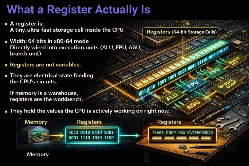 If memory is a warehouse, registers are the workbench.