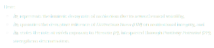 Motivation (M): A transient, dopamine-regulated emotional potential that temporarily amplifies goal pursuit. It operates as an initial spark — a biochemical burst that floods the reward circuitry, heightening attention and energy toward a goal. However, its half-life is short; without continual reinforcement, motivation decays rapidly. It depends on novelty, validation, or external stimuli to sustain itself, making it the least reliable source of long-term performance.