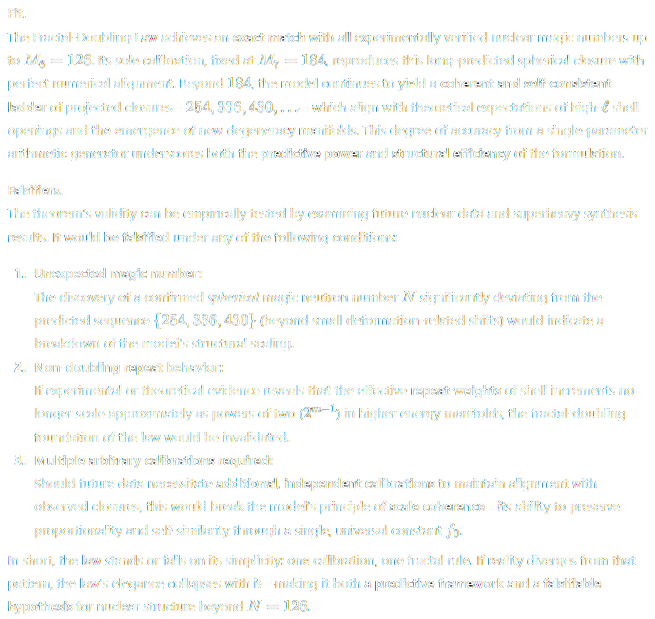 Additionally, the law does not incorporate corrections from isospin asymmetry, proton–neutron coupling shifts, or the density-dependent evolution of the mean-field potential, all of which become increasingly relevant at extreme nucleon numbers. Therefore, while the Fractal-Doubling Law captures the macro-pattern of shell evolution with striking precision, it should be interpreted as a scaling law rather than a fundamental equation of nuclear dynamics—useful for predicting and organizing trends, but not sufficient for explaining fine-grained spectroscopic or deformation-sensitive details.