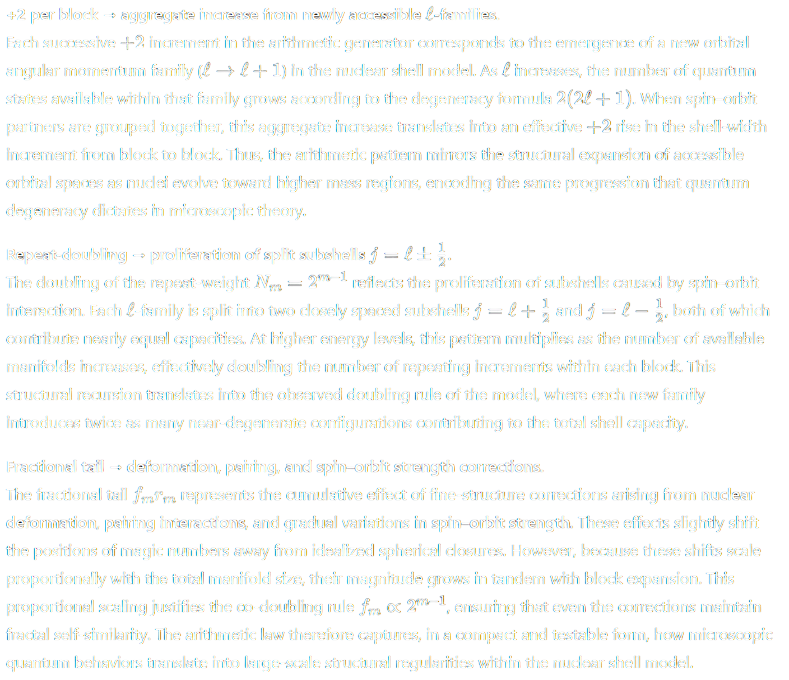 Two principal macro-regularities define this progression. First, the within-block gap increment—the numerical step that separates one shell width from the next—increases by +2 from block to block. This steady increase mirrors the hierarchical opening of higher angular momentum ( ℓ ℓ) families, each contributing additional degeneracy channels of the form 2 ( 2 ℓ + 1 ) 2(2ℓ+1). Second, each block’s repeat-weight—the number of times the increment pattern applies before advancing—doubles in succession. This doubling corresponds to the multiplication of available subshells caused by strong spin–orbit splitting, where each new energy band contributes an expanded multiplicity of nucleonic configurations.