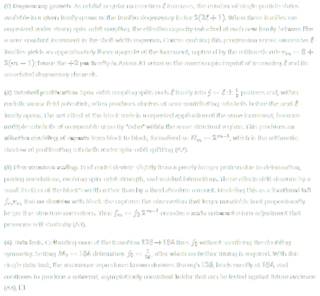 A2 — Repeat doubling. The increment’s repeat-weight—the number of times a given step is effectively applied—doubles with each new block. This doubling mirrors the proliferation of subshells that arise due to spin–orbit splitting. As nuclear levels split into 𝑗 = ℓ ± 1 2 j=ℓ± 2 1 ​ partners, the effective multiplicity of states approximately doubles, generating twice as many near-degenerate contributions per new block. In the arithmetic form, this becomes 𝑁 𝑚 = 2 𝑚 − 1 N m ​ =2 m−1 , producing a self-replicating, fractal-like doubling structure across the magic-number ladder.