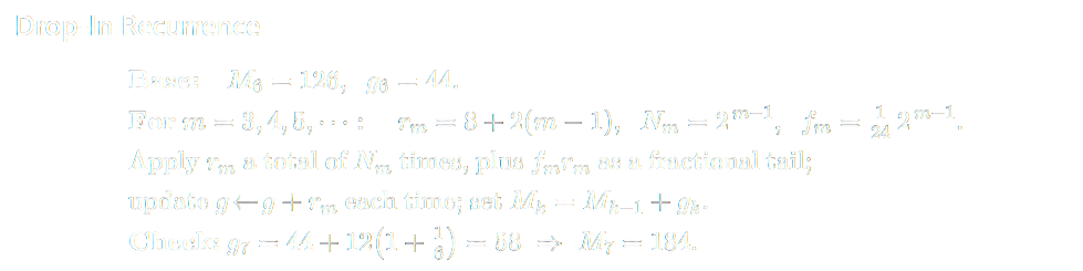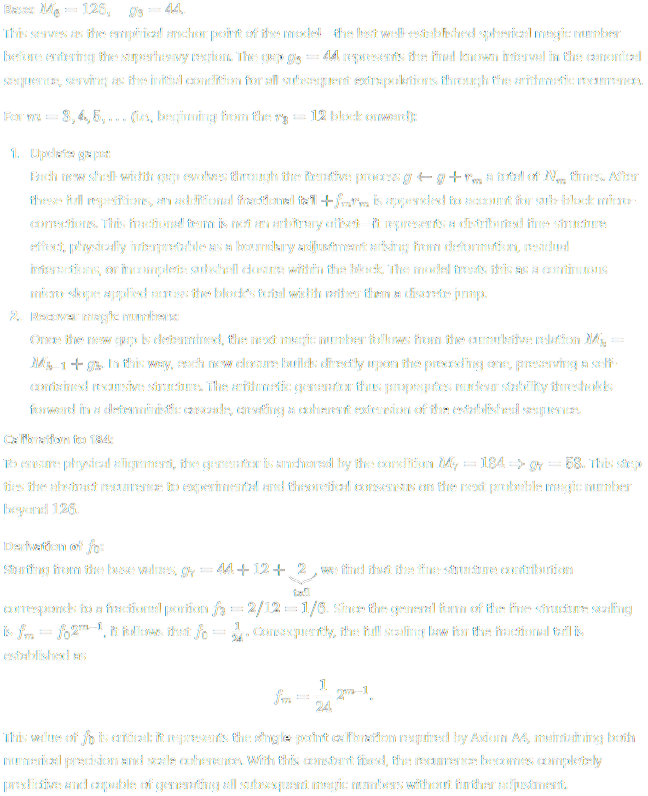 Finally, a subtle but crucial co-doubling fractional tail fine-tunes the cumulative progression to align precisely with the next observed spherical closure at 𝑀 7 = 184 M 7 ​ =184. This fractional adjustment is not arbitrary—it represents the fine-structure offset caused by deformation, pairing, and residual interactions, yet scales proportionally to the block’s own doubling law.