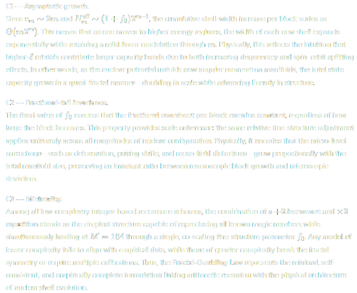 The Fractal-Doubling Law is fundamentally a phenomenological macro-law, not a first-principles derivation from quantum chromodynamics (QCD) or a self-consistent mean-field theory. Its purpose is to model the numerical architecture underlying observed nuclear magic numbers rather than to reproduce the complete microscopic interactions that generate them. As such, the law abstracts complex nuclear dynamics—spin–orbit coupling, pairing forces, and deformation effects—into a minimal arithmetic framework designed to reveal large-scale regularities rather than local variations.