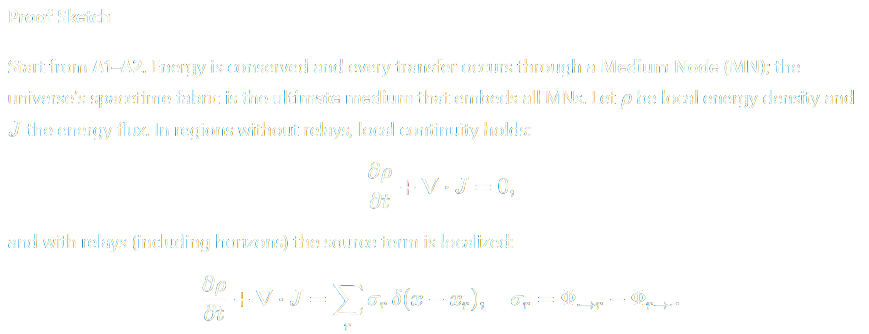 From A2 and A5, any energy apparently “lost” to a horizon reappears elsewhere as redshifted, emitted, or diffused energy;