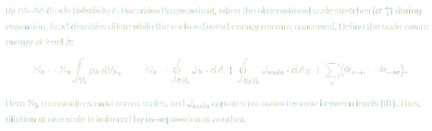 Energy, bound by the Conservation Axiom (A1), cannot cease nor originate from nothing; it can only reformulate its manifestation through different mediums (A2) and observational scales (A3). When energy density diminishes at one level of structure—such as during cosmic expansion or radiation redshift—it reappears redistributed at another, maintaining continuity through Recursive Propagation (A4).