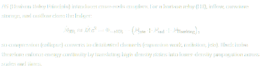 Horizon relays (A5), including black holes, singularities, and cosmological horizons, serve as cross-scale couplers, ensuring that compression and dissipation are merely opposite faces of the same transformation. Energy drawn into a black hole’s curvature is not destroyed but encoded into geometric potential, later re-expressed as radiation, jets, or metric expansion. Thus, gravitational collapse and universal expansion are complementary operations of the same recursive system.