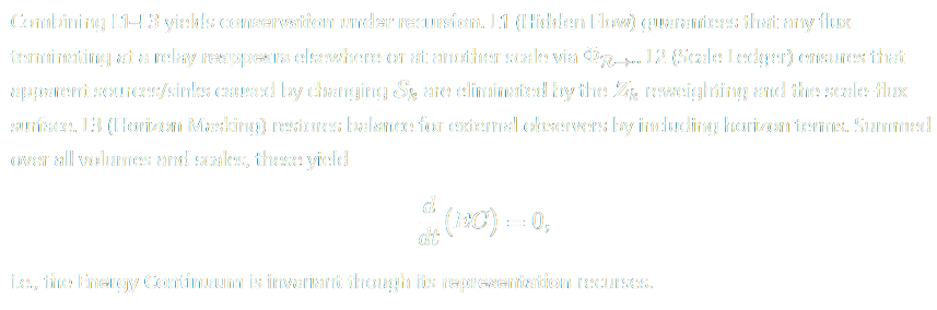This foundational law anchors the theorem. Every manifestation of energy, from light to mass to curvature, is a temporary configuration of the same continuum. Conservation does not imply stillness but continuity through transformation, ensuring that the total Energy Continuum (EC) remains invariant, even as its expressions evolve through time, space, and scale.